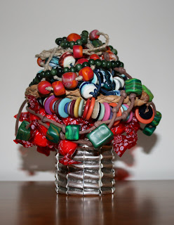 Por isso, estando o Natal mesmo, mesmo à porta, peguei num punhado de rebuçados - embrulhados em celofane vermelho com letras brancas a dizer flocos de neve mais a marca, que agora não digo - pousei-os em cima duma pulseira - de que gosto muito - e enrosquei-lhe um colar - daqueles que fazia há mais de 20 anos atrás, com berloques de massa fimo, enfiados em cordões, de couro, usados nos sapatos, bem encerados -, e pronto.